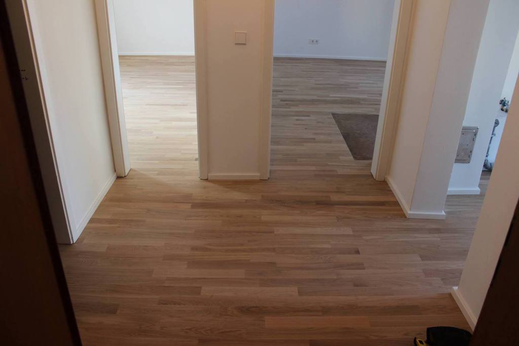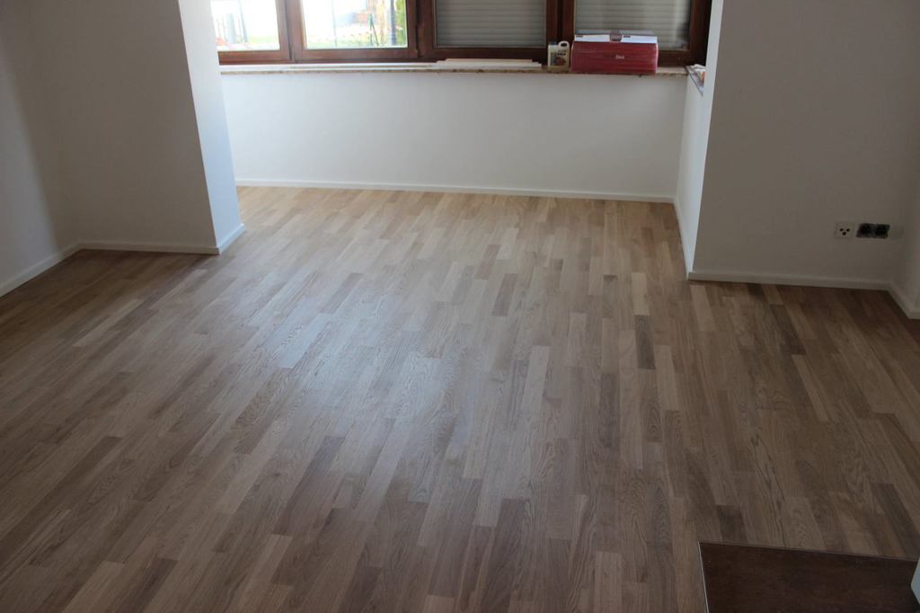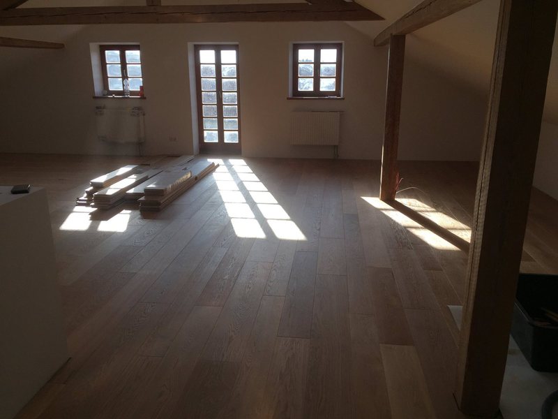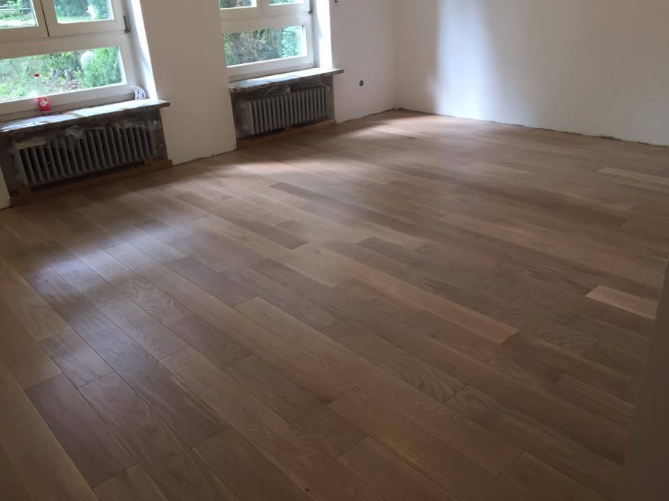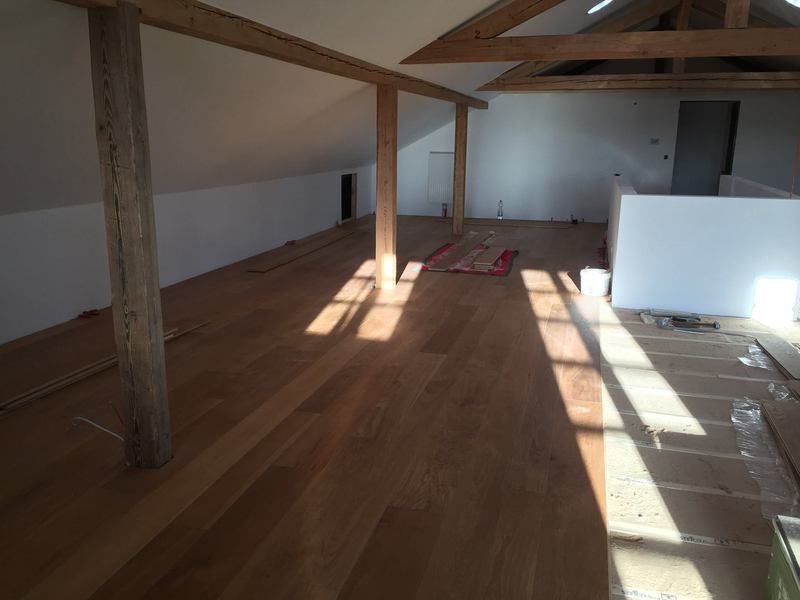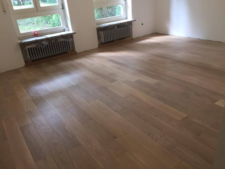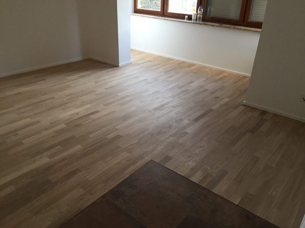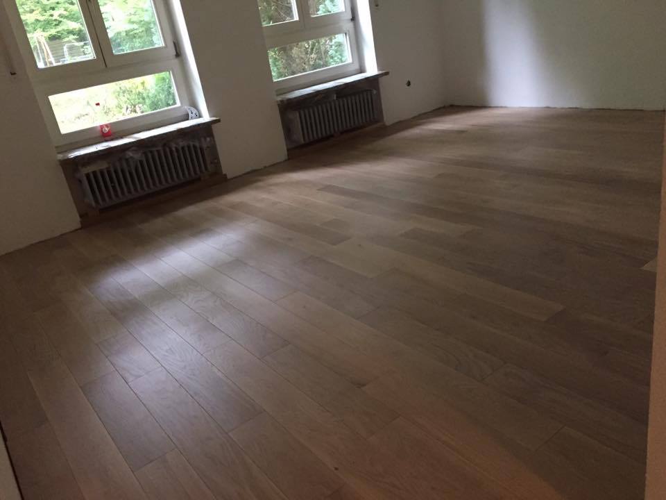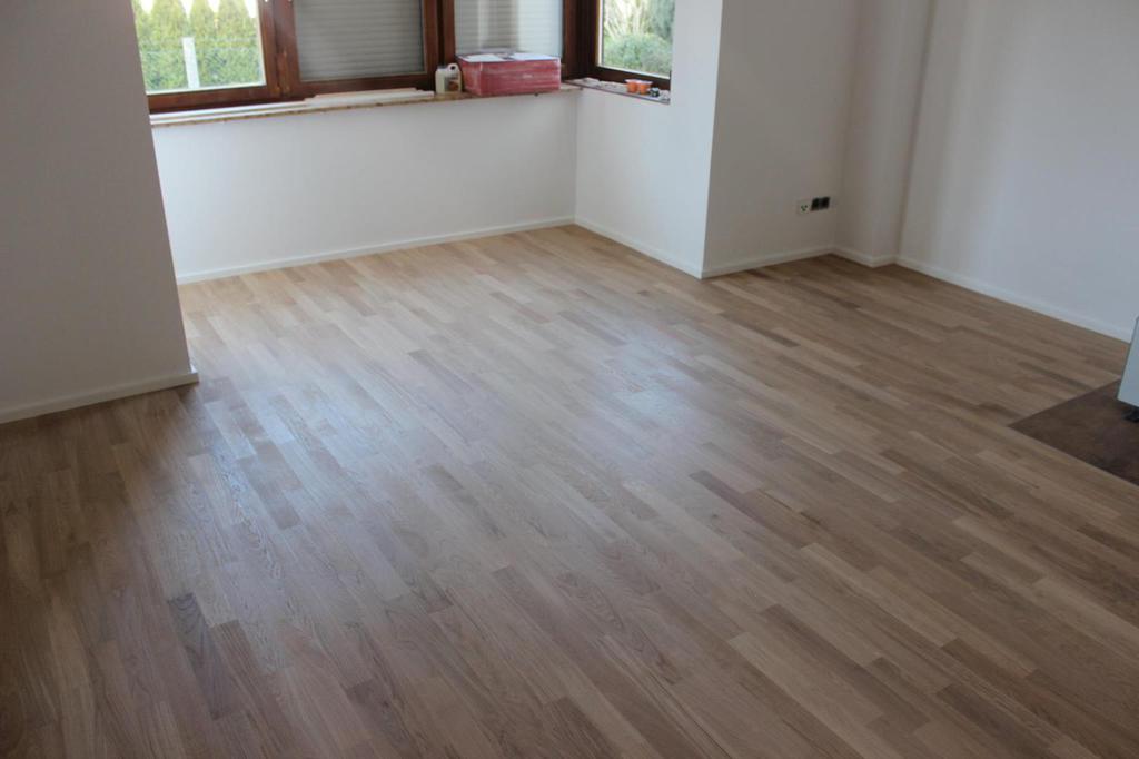 Nach sehr aufwendigen Vorarbeiten am Untergrund, haben wir Zweischichtparkett Eiche weiß geölt verlegt und weiße Sokelleisten montiert.