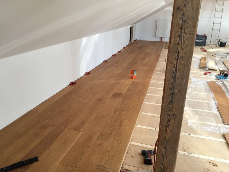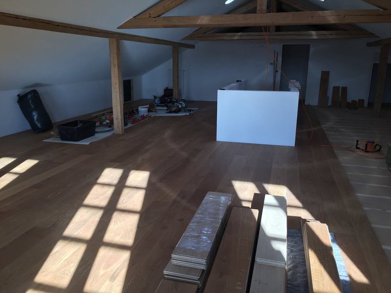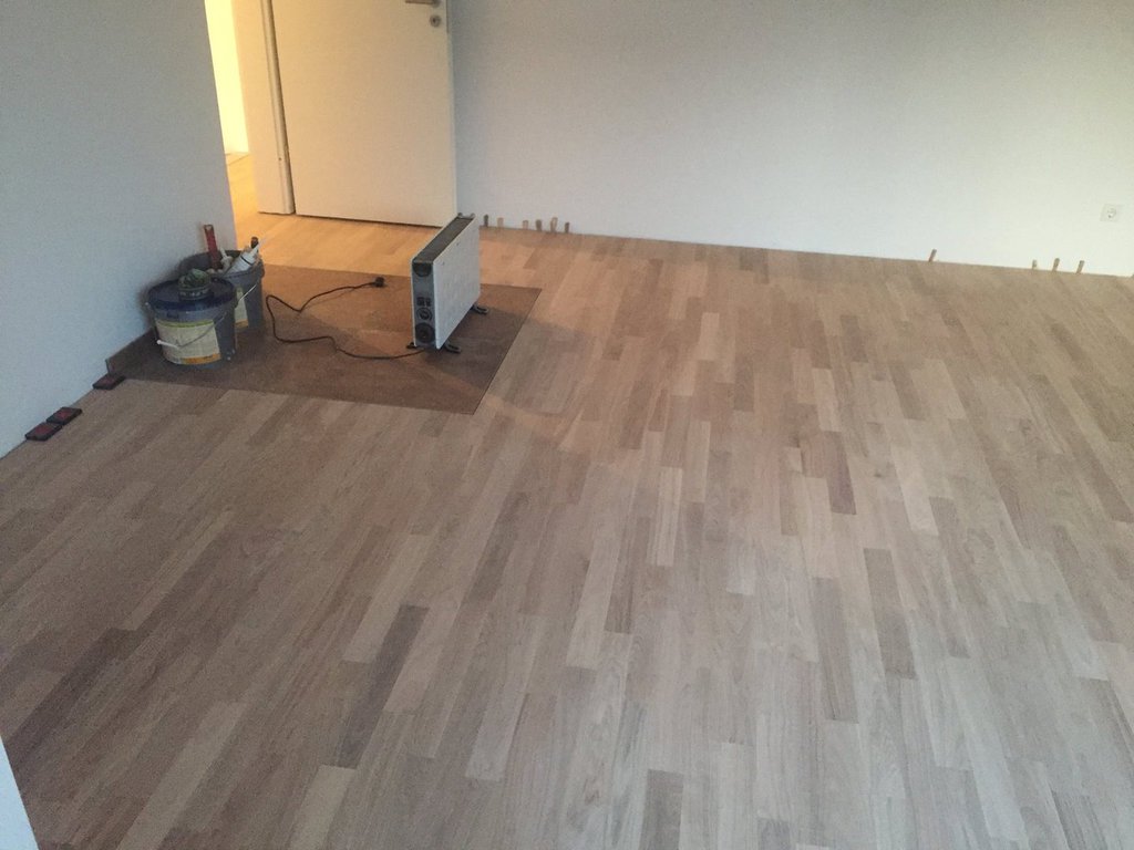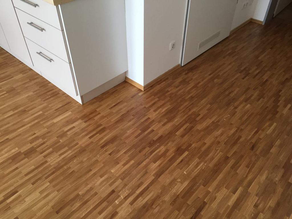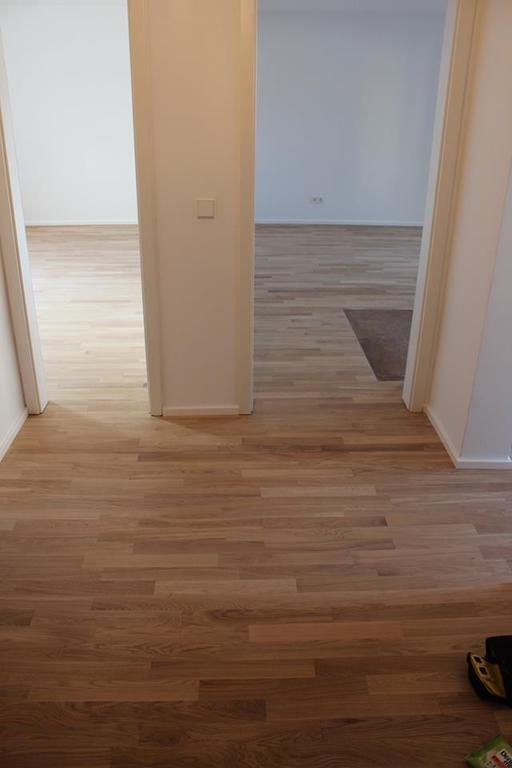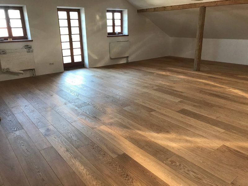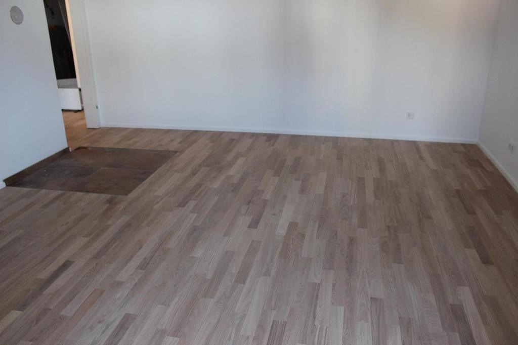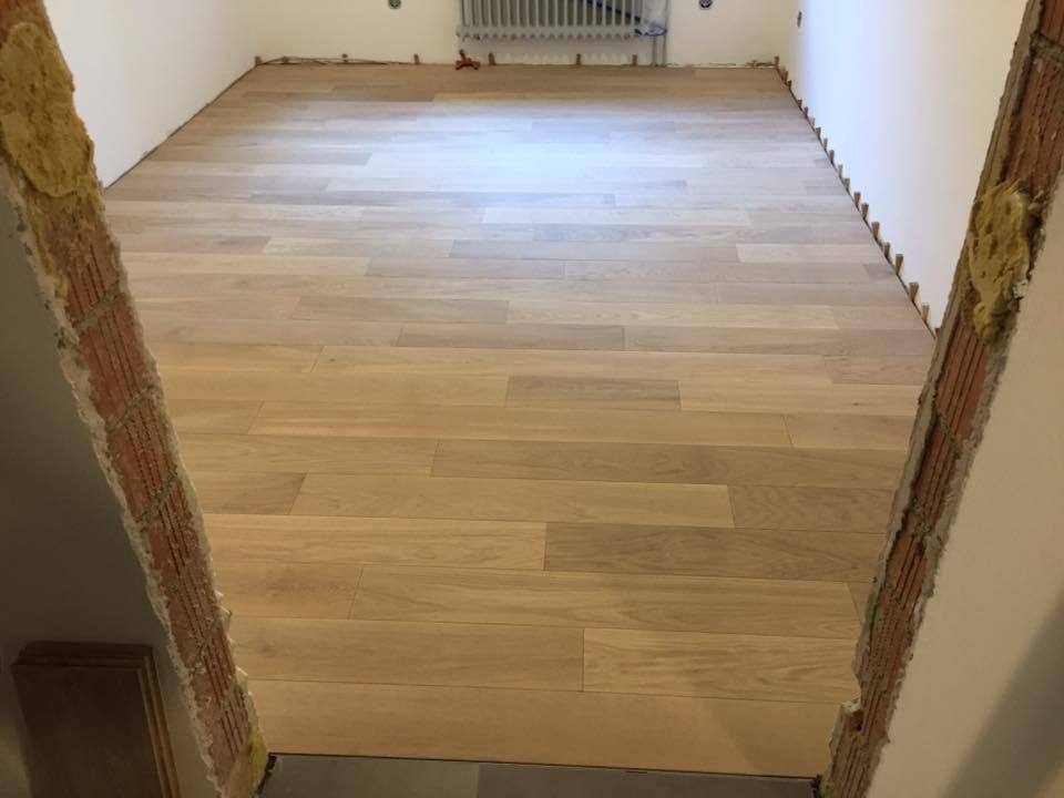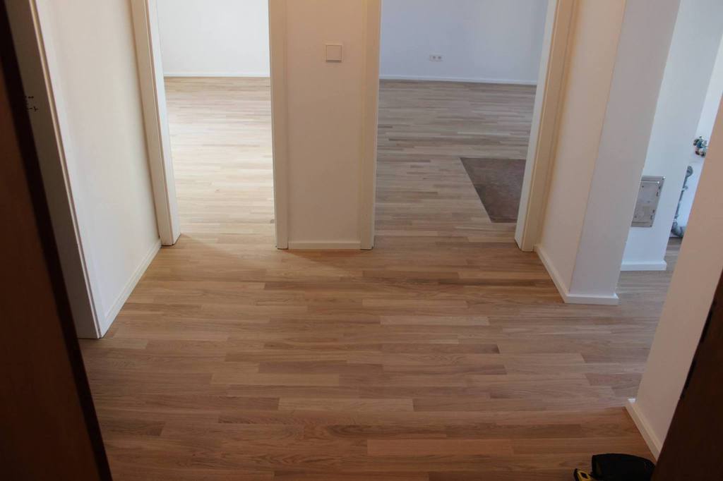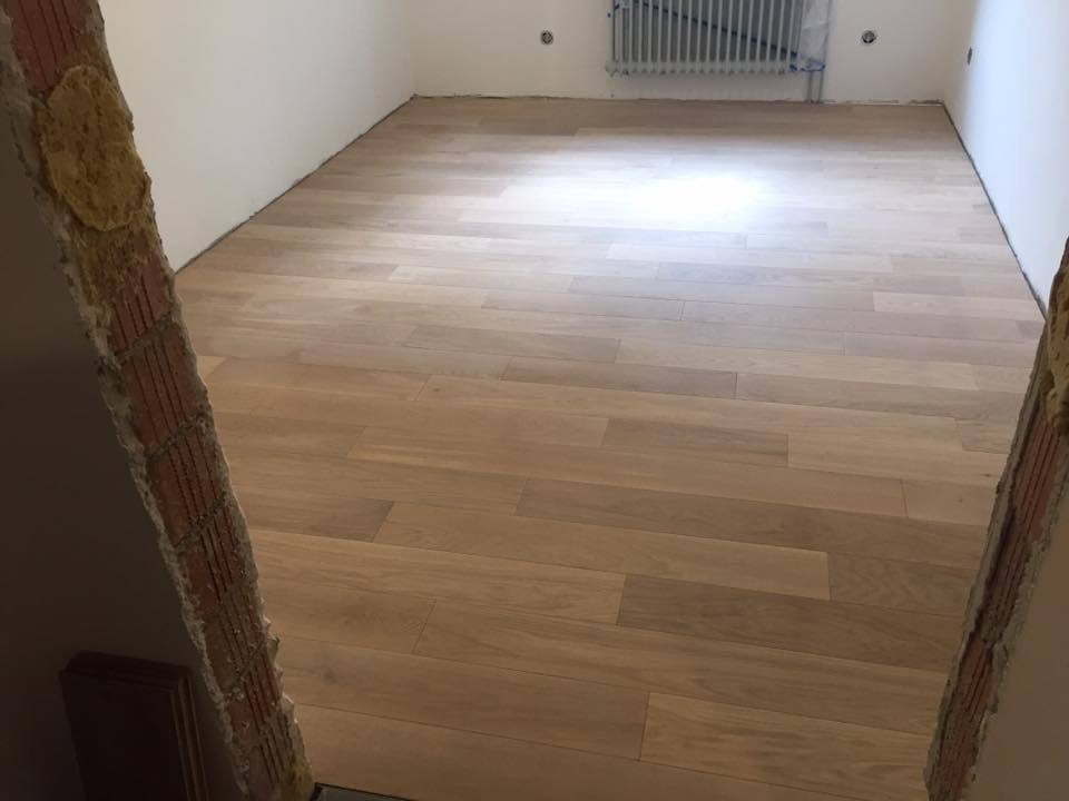 Nach sehr aufwendigen Vorarbeiten am Untergrund, haben wir Zweischichtparkett Eiche weiß geölt verlegt und weiße Sokelleisten montiert.