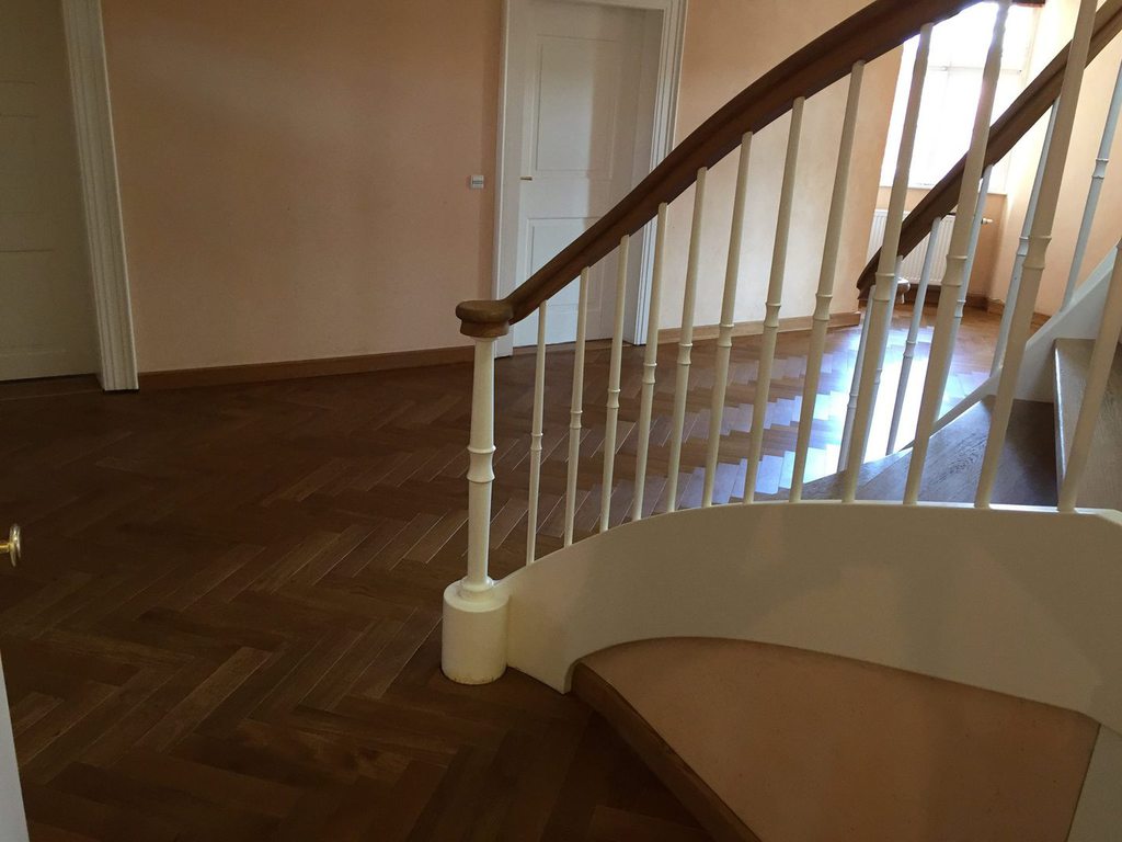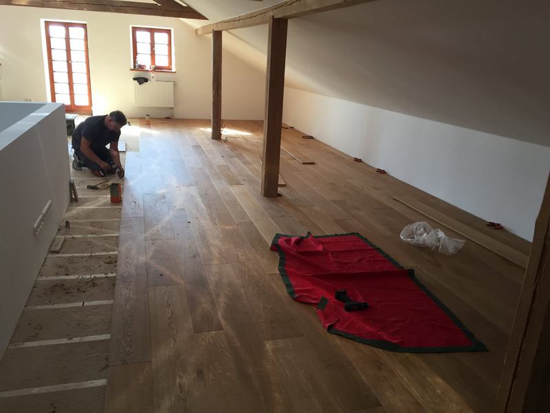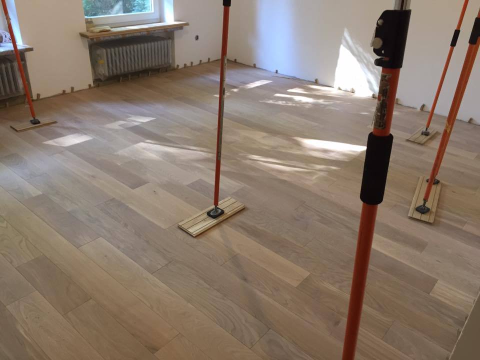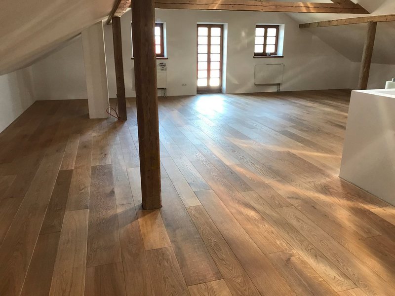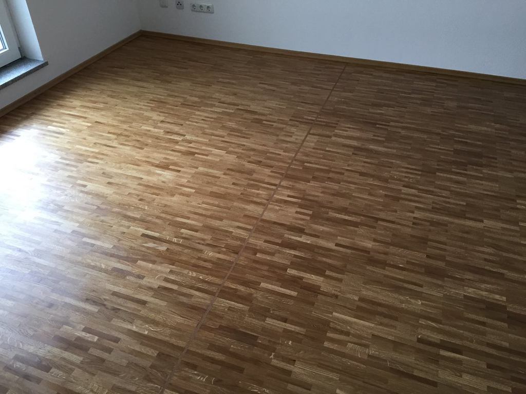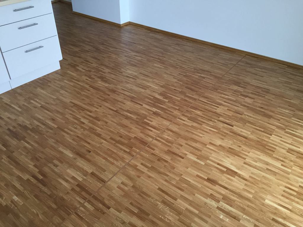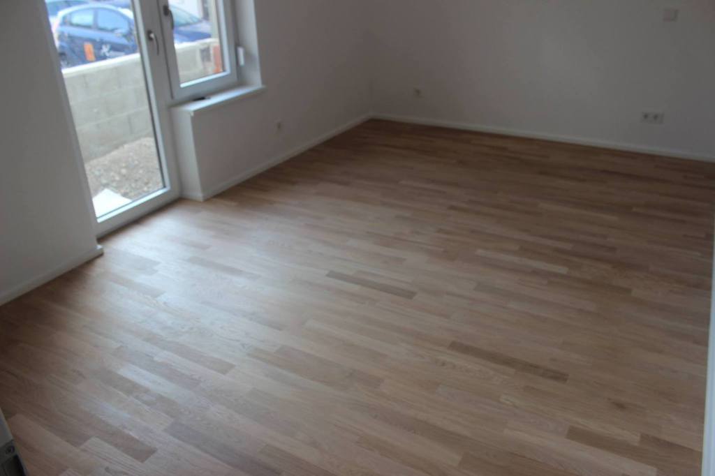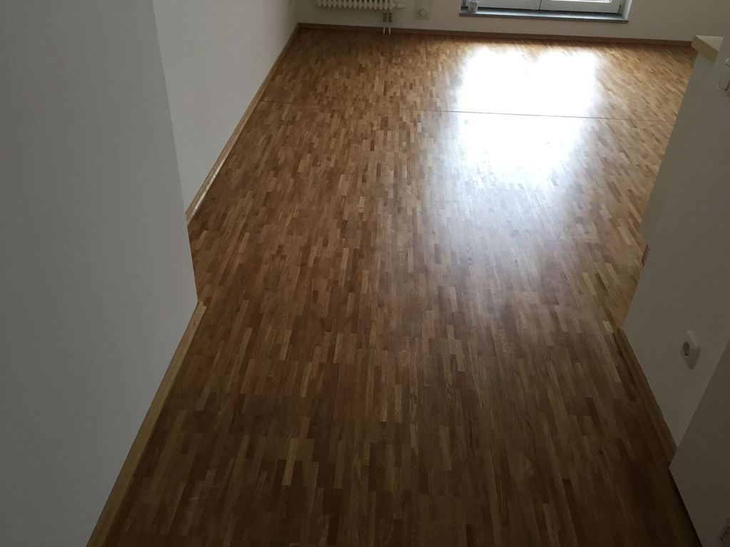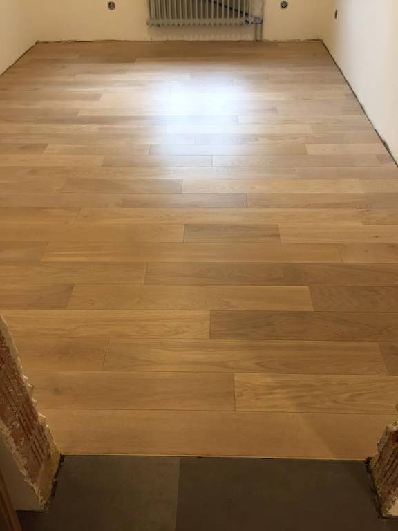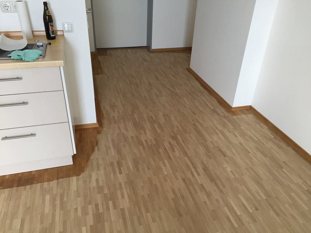 Nach sehr aufwendigen Vorarbeiten am Untergrund, haben wir Zweischichtparkett Eiche weiß geölt verlegt und weiße Sokelleisten montiert.