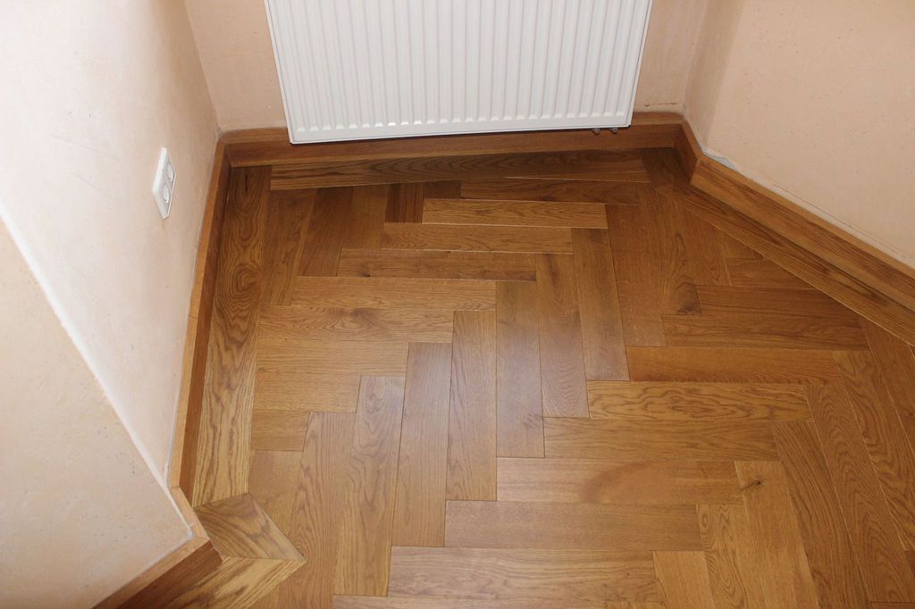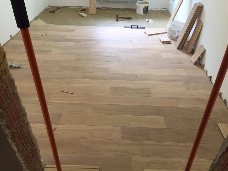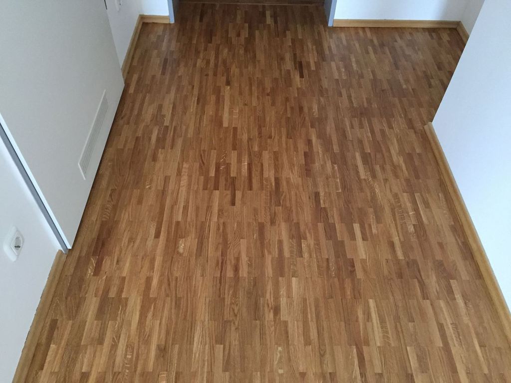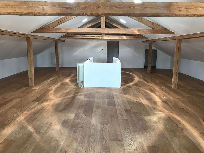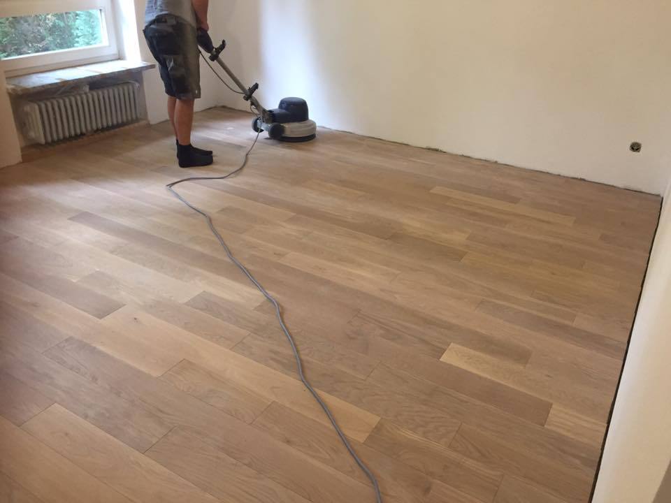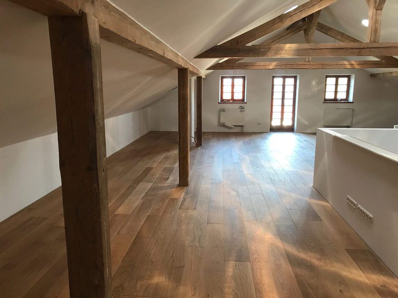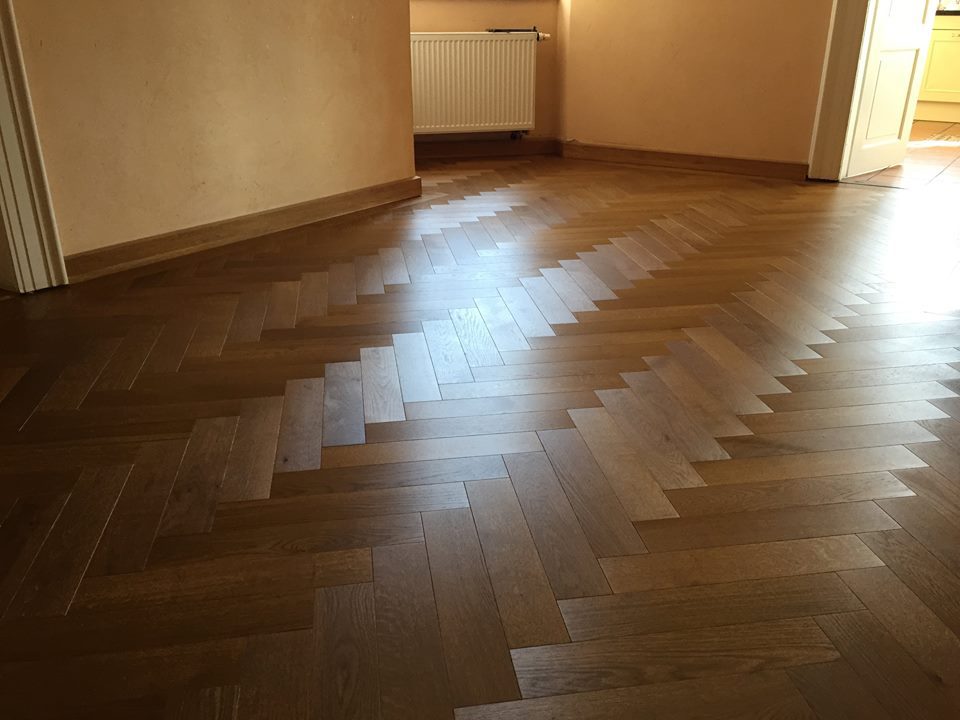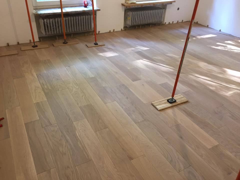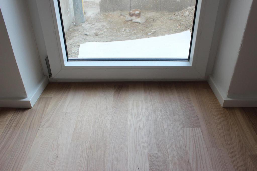 Nach sehr aufwendigen Vorarbeiten am Untergrund, haben wir Zweischichtparkett Eiche weiß geölt verlegt und weiße Sokelleisten montiert.