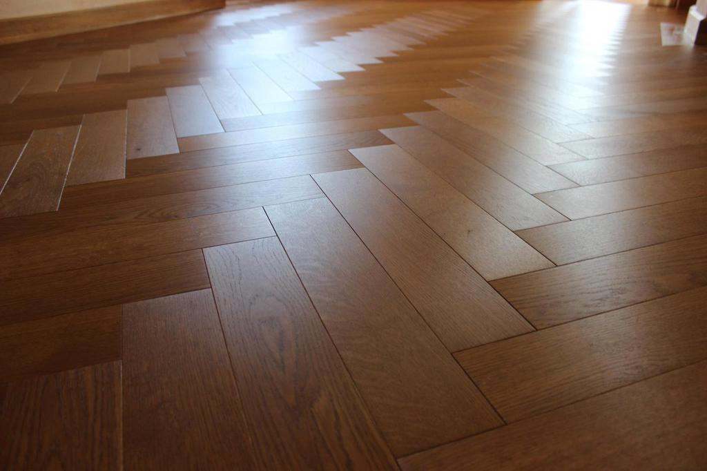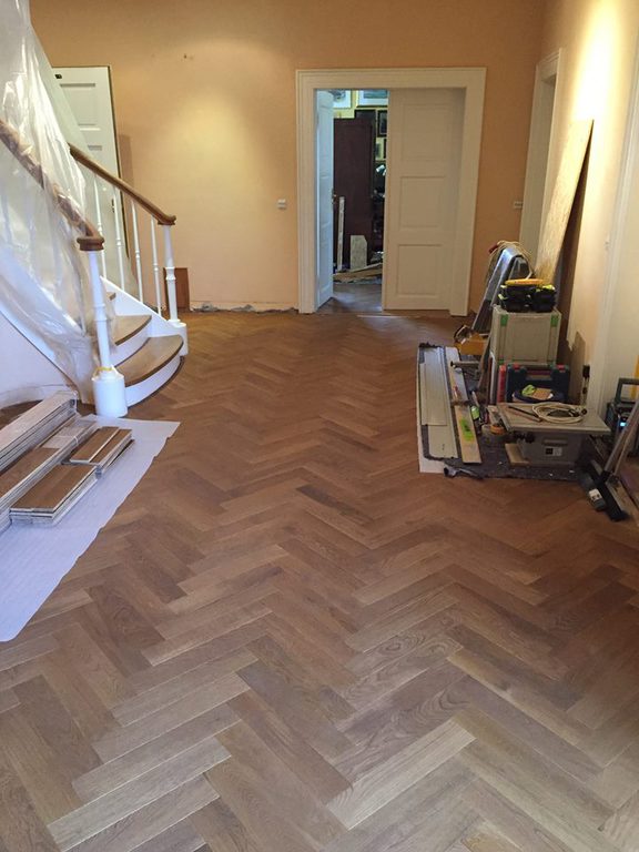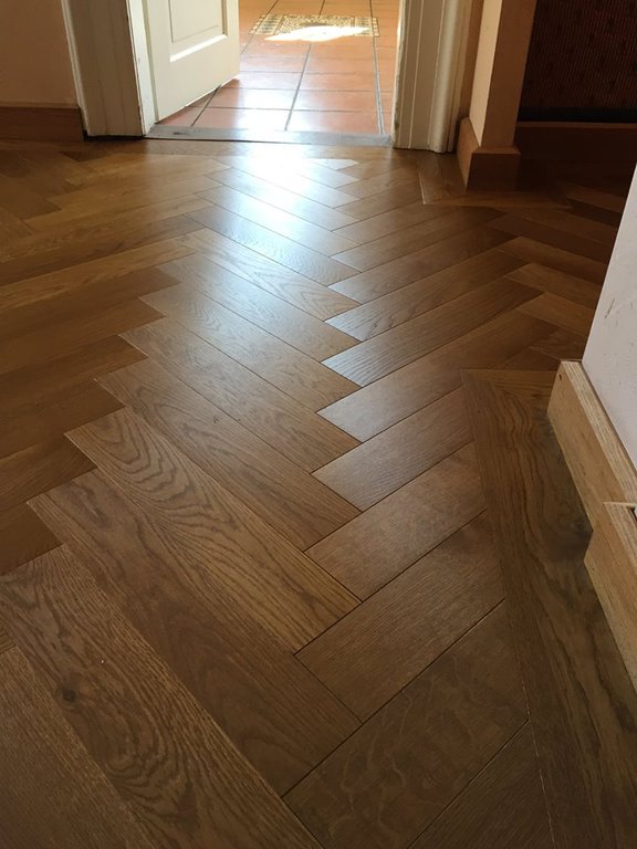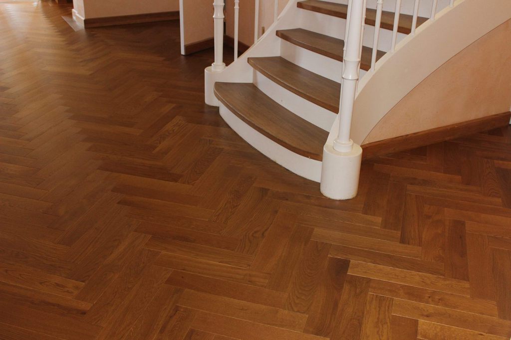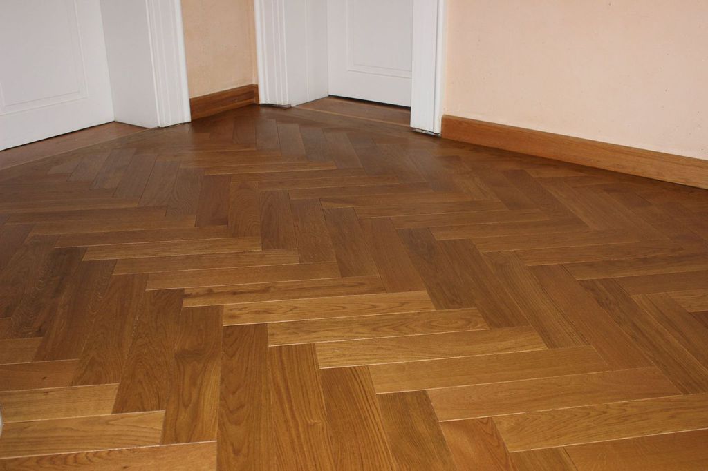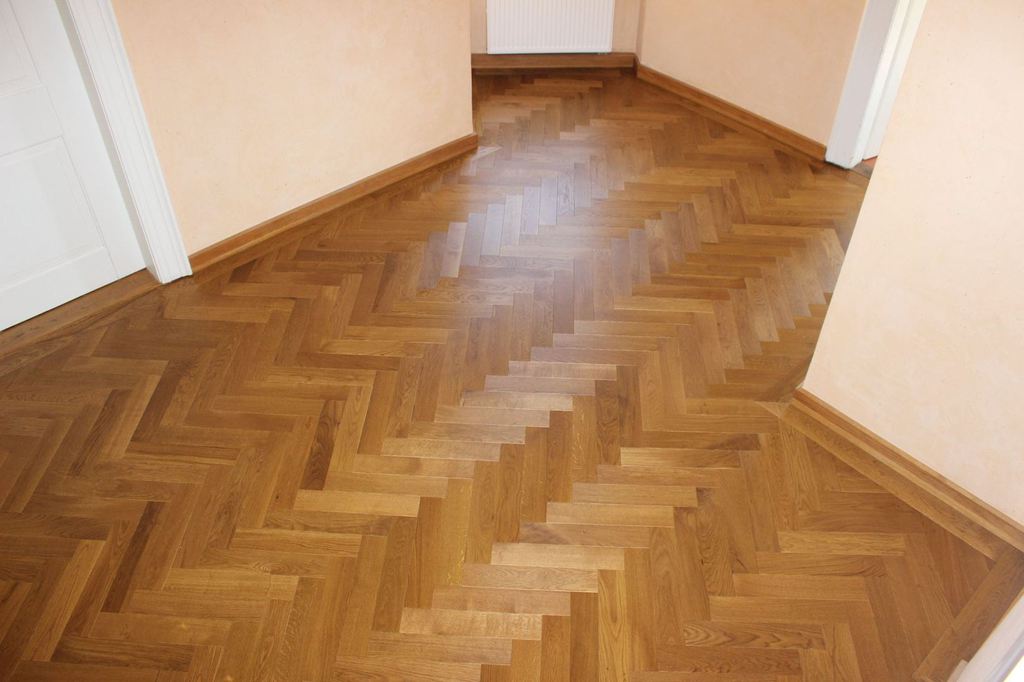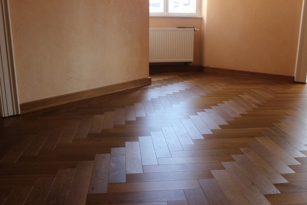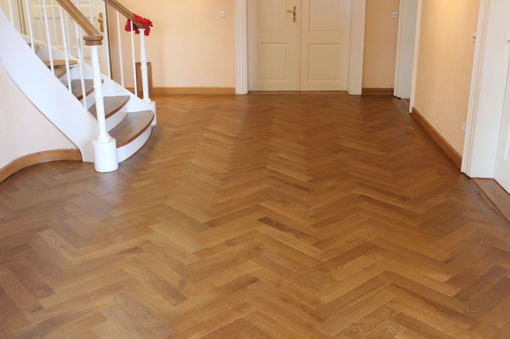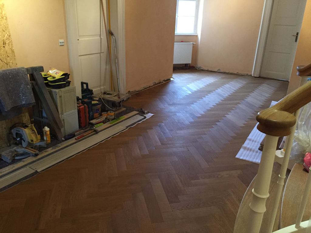 Anschließend wurde neues Massivparkett im Fischgrät mit Randfries verlegt.