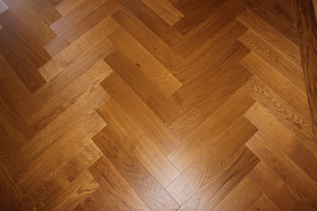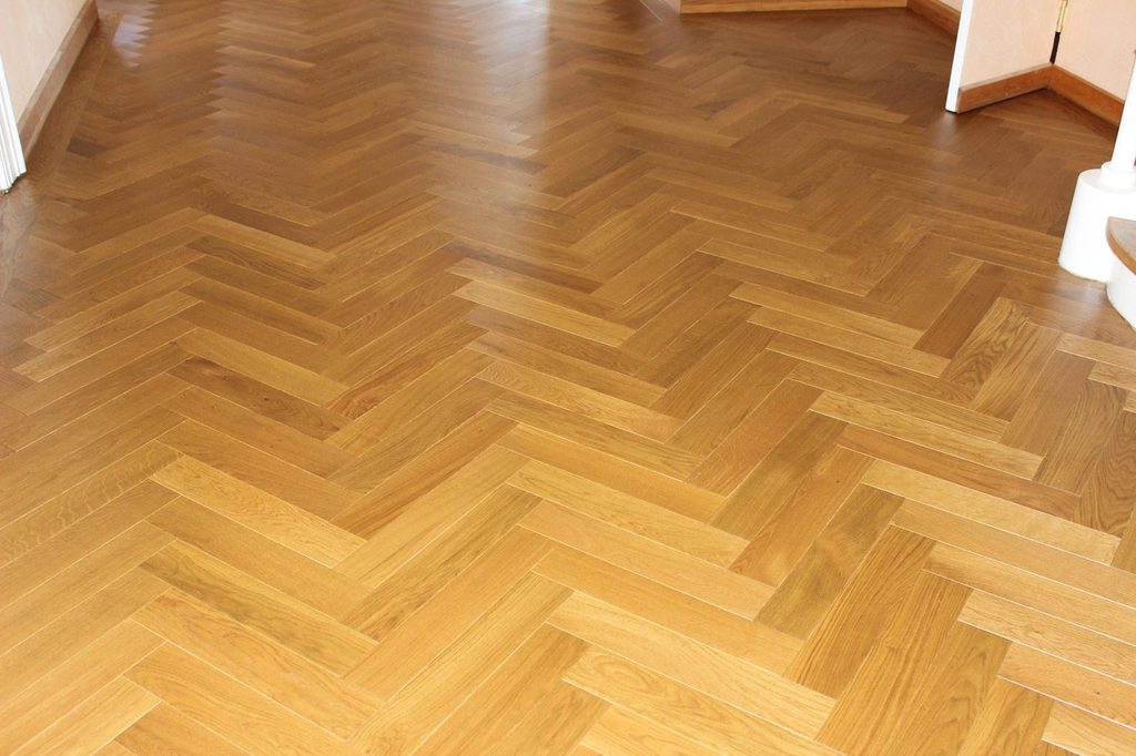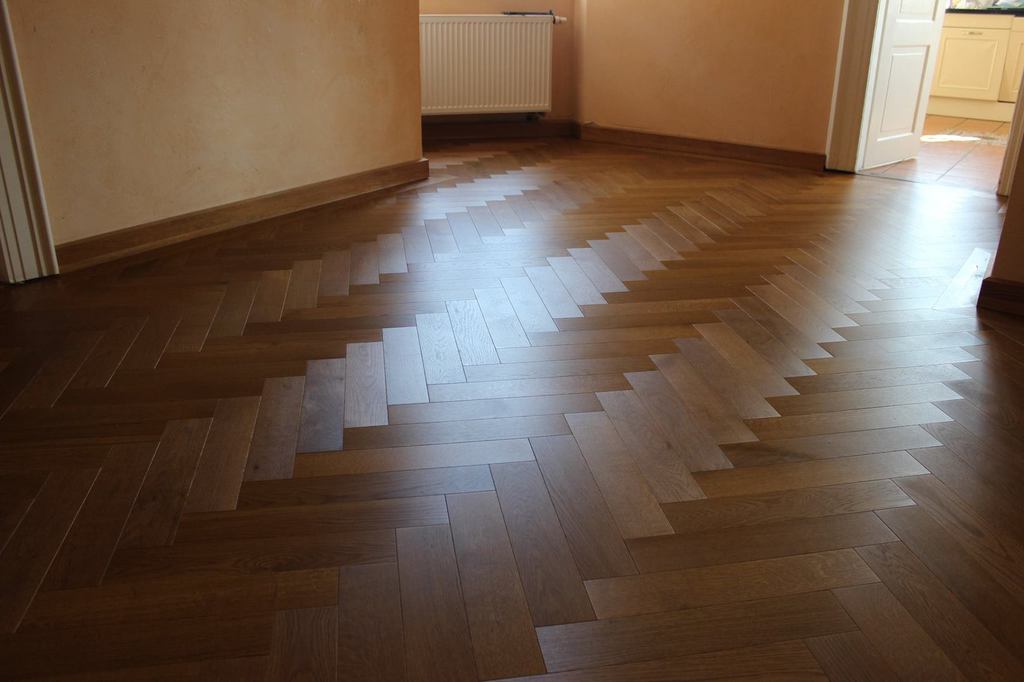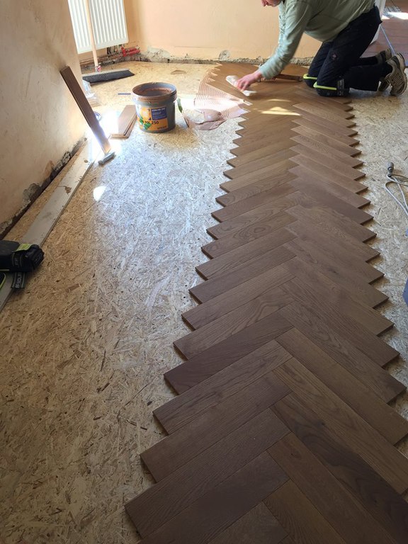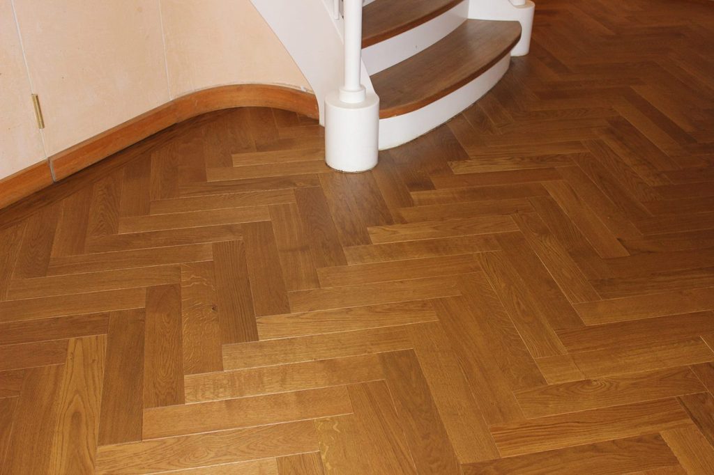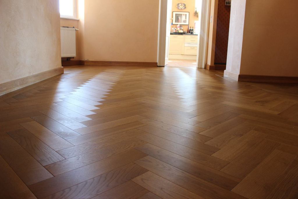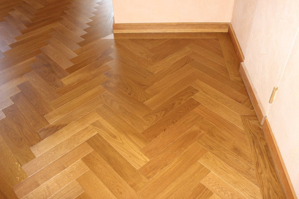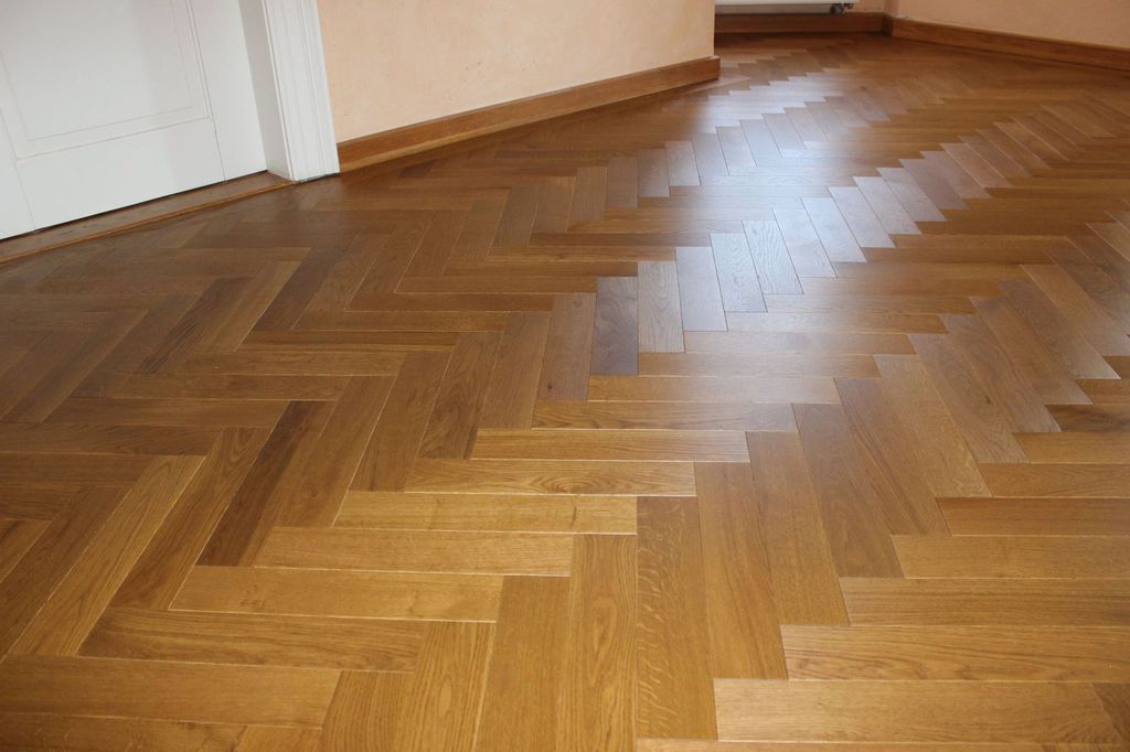 Anschließend wurde neues Massivparkett im Fischgrät mit Randfries verlegt.
